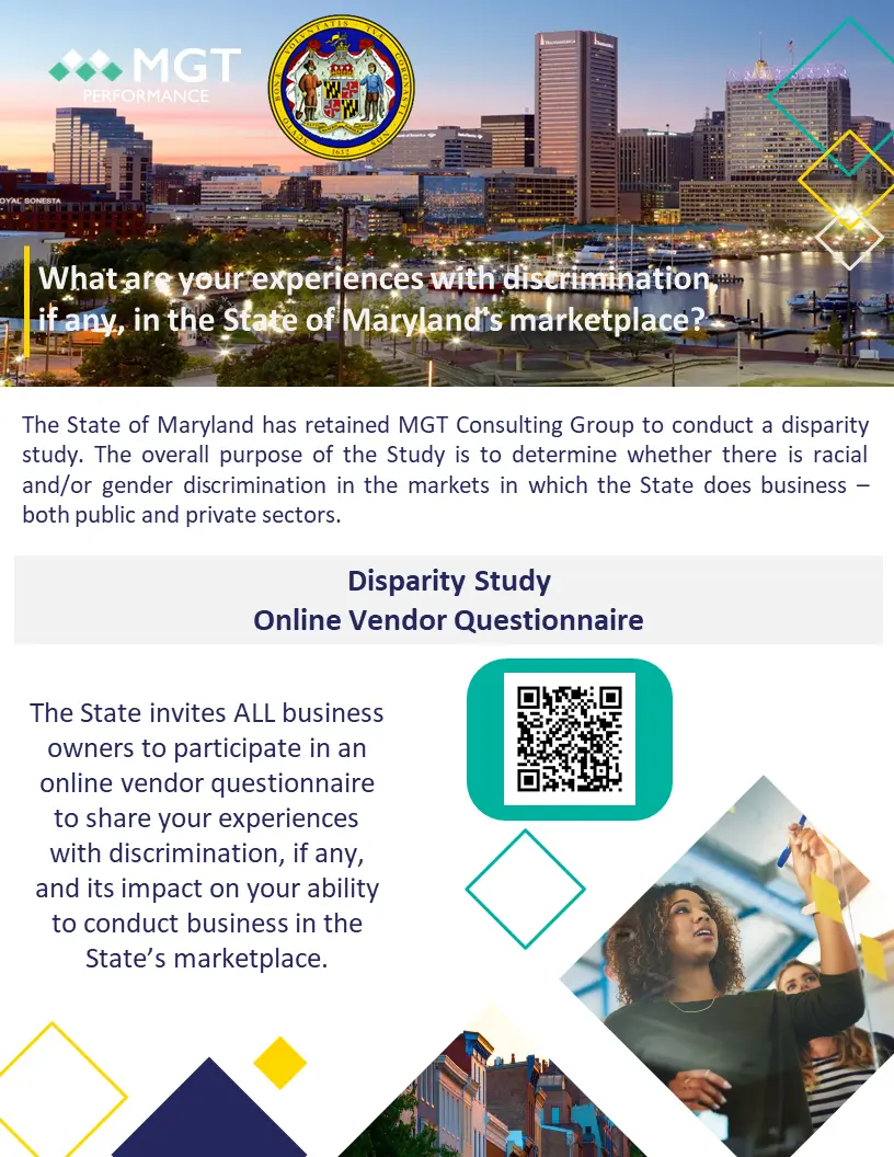 Vendors in Maryland are invited to complete the State of Maryland Disparity Study where business owners can share feedback on their results and treatment of business in the state of Maryland.